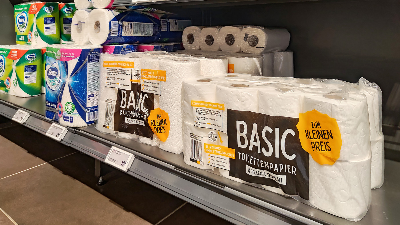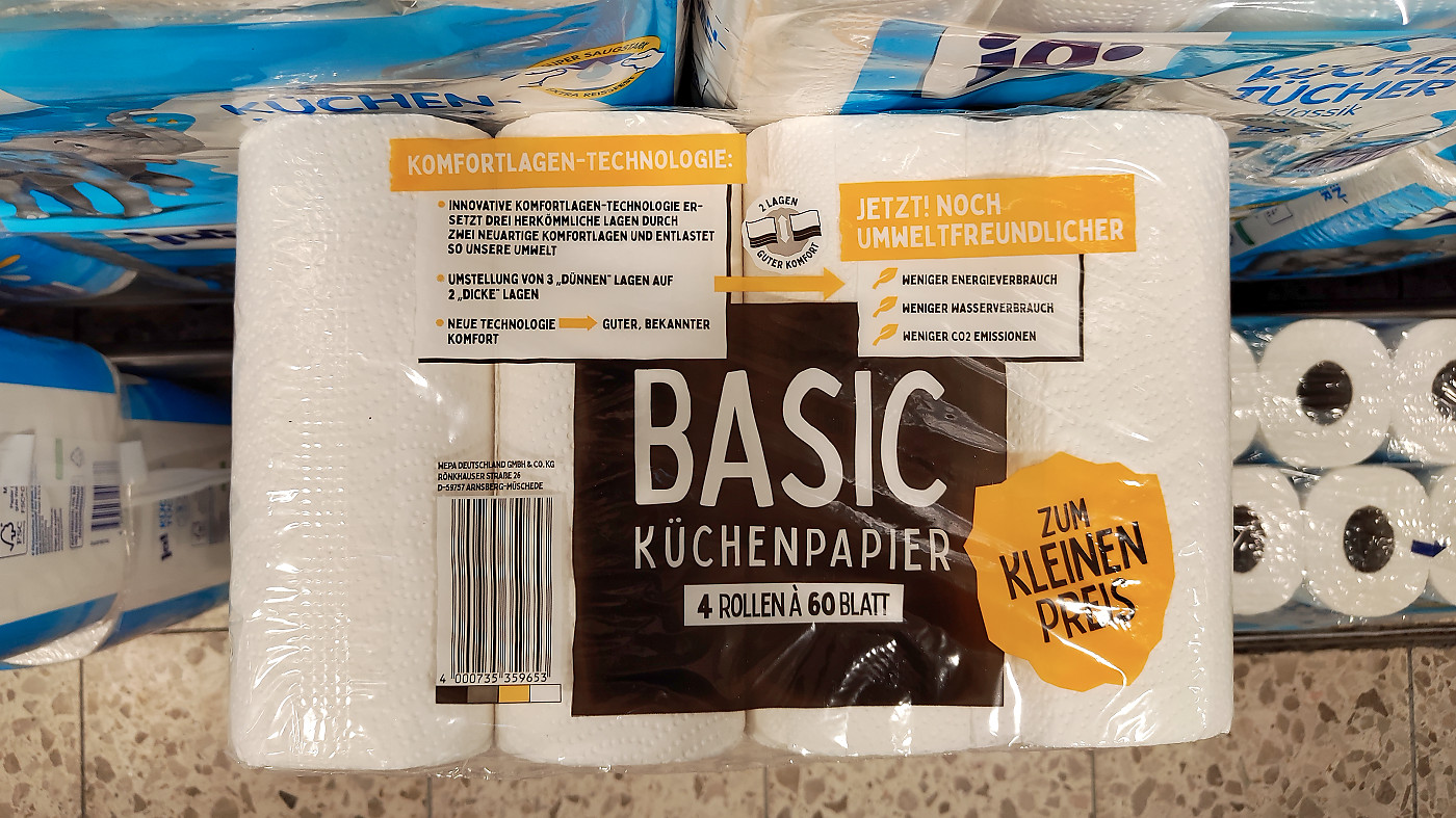 Nun sind die genannten Krisen aber entweder beendet oder (traurigerweise) Teil der Alltagsrealität geworden. Und während man für Penny angibt, die Artikel dort nicht mehr (oder allenfalls noch in „Restposten“) zu verkaufen, steht in erstaunlich vielen Rewe-Märkten quer durch Deutschland derzeit weiterhin „Basic Küchenpapier“ und „Basic Toilettenpapier“ – mit dem gut sichtbaren Zusatzlabel „ZUM KLEINEN PREIS“.
